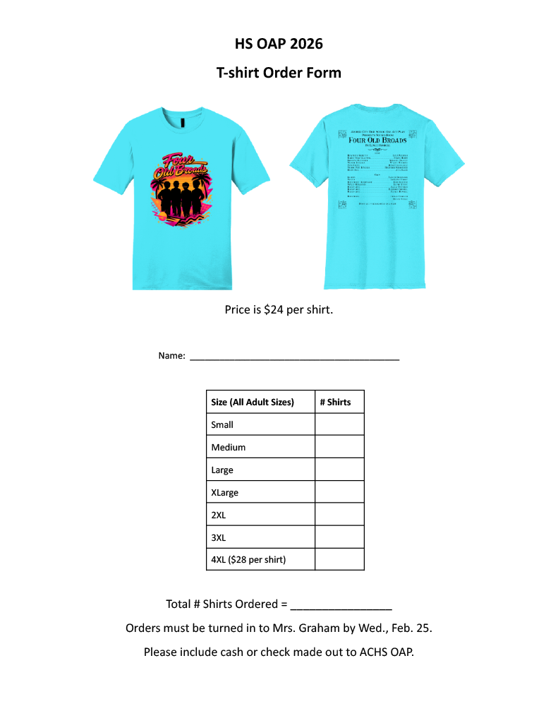 It's time to place your OAP tshirt orders! See below for details. Students will get a copy of the order form on Thursday, Feb. 19 at rehearsal. Orders and money are due to Mrs. Graham by Wed., Feb....